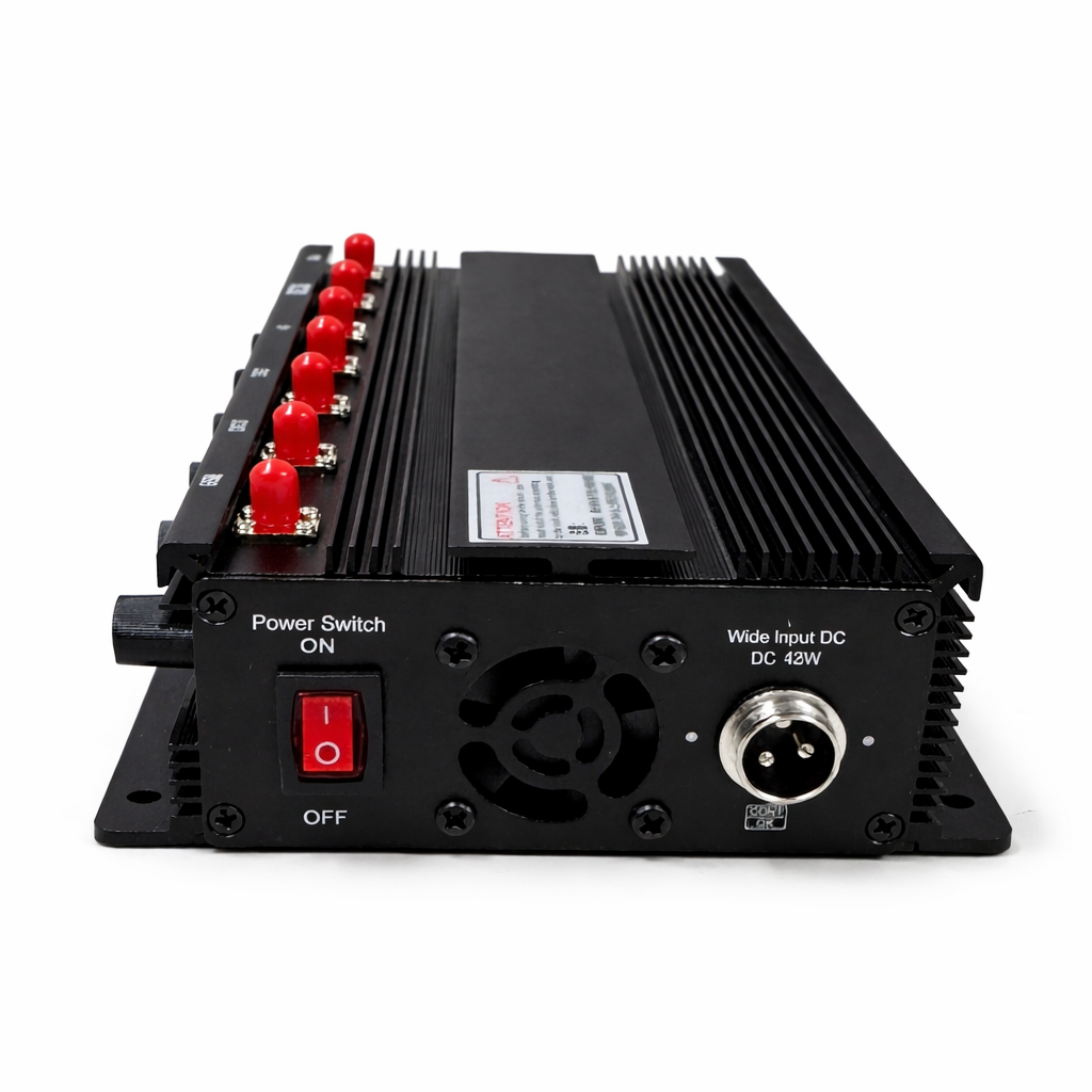 A 6-antennás PROFI GSM, DCS, 3G, 4G, Wi-Fi és GPS jelblokkoló több sáv zavarását biztosítja különböző frekvenciákon, ha jelmentes zónára van szüksége. Sokoldalú jelblokkoló, amely minden felhasználó igényeit kielégíti. A készülék tökéletes védelmet nyújt bármilyen lehallgatás vagy megfigyelés ellen. A beépített akkumulátornak, az aktív hűtésnek és a magas 12 W-os teljesítménynek köszönhetően a blokkoló 40 méteres sugarú körben védelmet nyújt az információszivárgás ellen, amikor és ahol csak szüksége van rá.