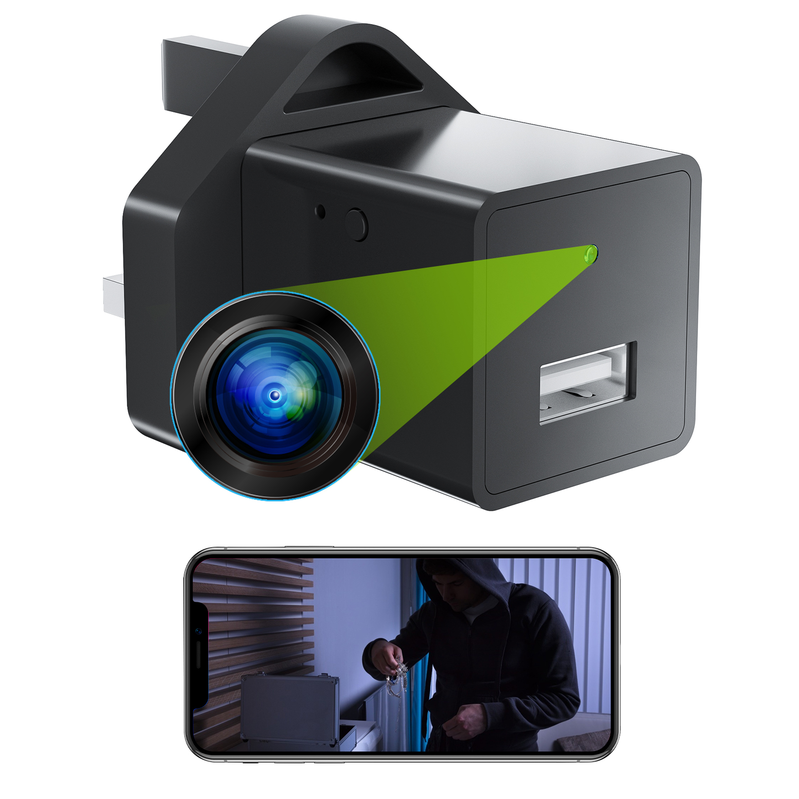 A hálózati adapterben található Wi-Fi kamera egy feltűnésmentes rejtett kamera, amely Full HD felbontású videókat rögzít, így a kapott kép nagyon jó minőségű, és klasszikus töltőként is szolgál a telefonok és más eszközök számára. A mozgásérzékelésnek és a végtelenített hurokfelvételi lehetőségnek köszönhetően ez a rejtett kamera hosszú távú megfigyelésre is alkalmas. A kamera beépített Wi-Fi modullal rendelkezik, amely lehetővé teszi a vezérlést, valamint az okostelefonon történő megfigyelést az alkalmazás segítségével (iPhone, Android támogatás). A készülék 90°-os betekintési szöggel rendelkezik. A készülék akár 128 GB kapacitású MicroSD memóriakártyára is képes rögzíteni. A készülék lehetővé teszi a nonstop működést áram alatt.