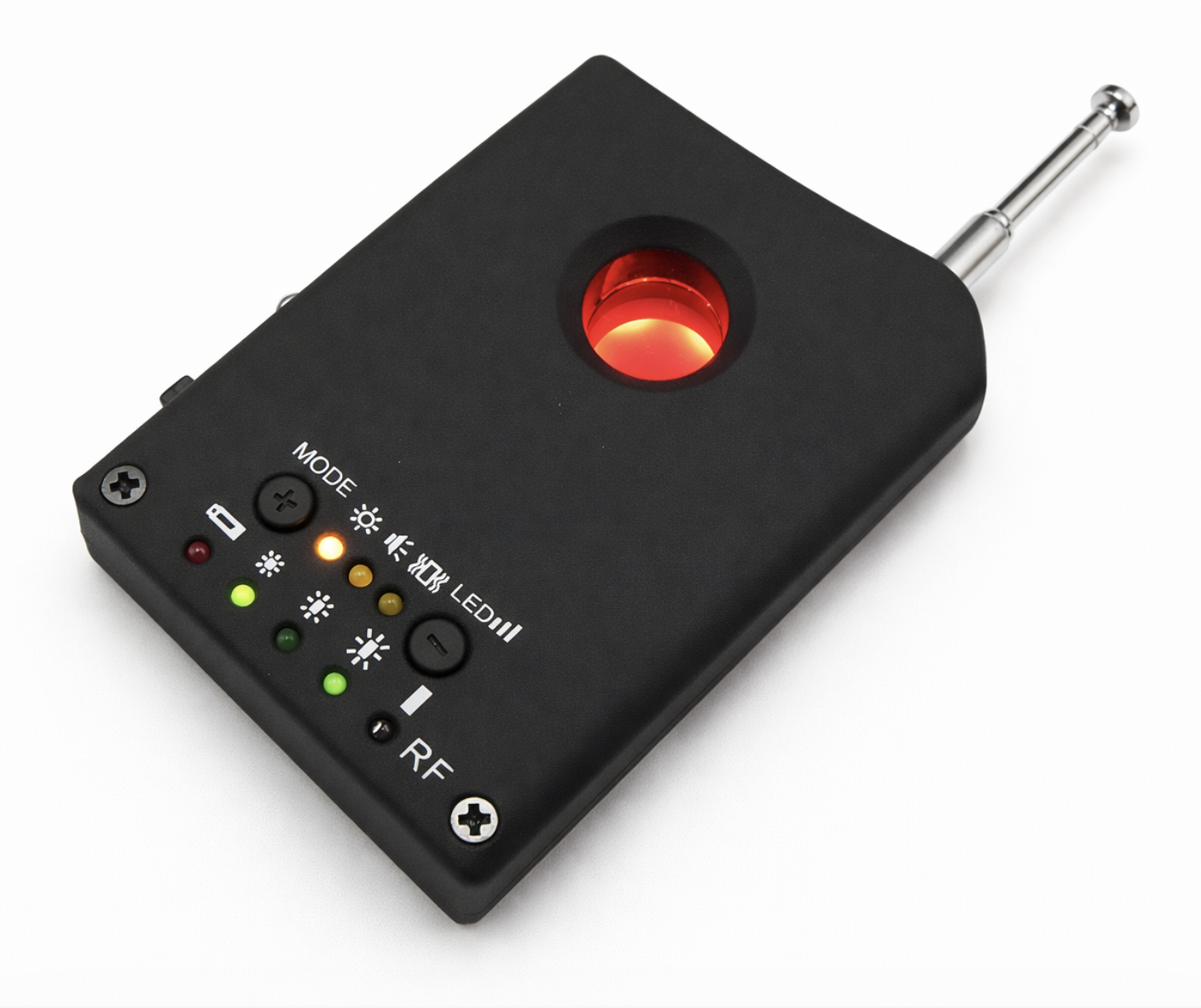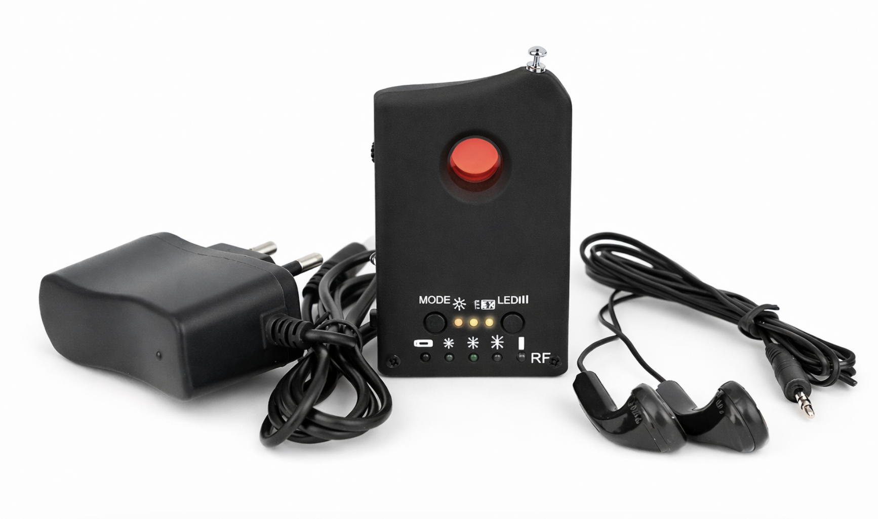 Ez az eszköz két eszközt tartalmaz egyben. Először is rejtett kameradetektorként szolgálhat (CCD és CMOS lencsék). Második funkciója vezeték nélküli jeldetektorként szolgál. Ilyen módon képes felismerni pl. a GPS-eszközöket, de nem hagyja figyelmen kívül a jelblokkolókat vagy a lehallgatókat sem. Az 1MHz-től 6,50 GHz-ig terjedő frekvencián működő összes eszközt érzékeli. Ha egy miniatűr kamera egy "pinhole" (mikro) lencsével jól el van rejtve, szinte lehetetlen észlelni. És folyamatos tápegységgel rendelkezik, több hónapig is használhatja. A klasszikus rádiódetektorok csak a vezeték nélküli kamerákat érzékelik. Ha azonban kábelkamerát vagy fényképezőgépet érzékelnek nagyfrekvenciás detektorokkal, akkor ezt a spektrumdetektorot kell használni. Az érzékelő lencséket érzékel, azaz nem számít, aktív vagy inaktív a kamera. Beállíthatja az érzékelési érzékenységet az eszközön. Azt is könnyen megtudhatja, hogy a jelforrás milyen messze van Öntől. Erre LED-diódokat használnak, amelyek megmutatják, hogyha a forráshoz közeledik. Manapság mindent megfigyelnek, és ha legalább néhány nemkívánatos elemet szeretne megtalálni, próbálja ki ezzel a legolcsóbb, de hatékony detektorral. A helyiségeiben, mielőtt bárki bizalmas információkat szerezhet Önről és megtámadhatja magánéletét.