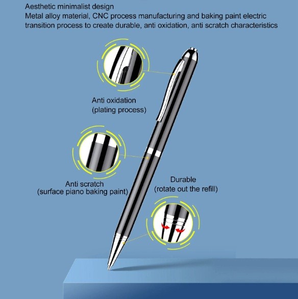 A készülék strapabíró fémötvözetből készült, modern CNC technológiával megmunkálva, felületén égetett festéssel. Ez a kialakítás hosszú élettartamot, oxidáció- és karcállóságot biztosít, így a toll-diktafon még gyakori használat mellett is megőrzi elegáns megjelenését.